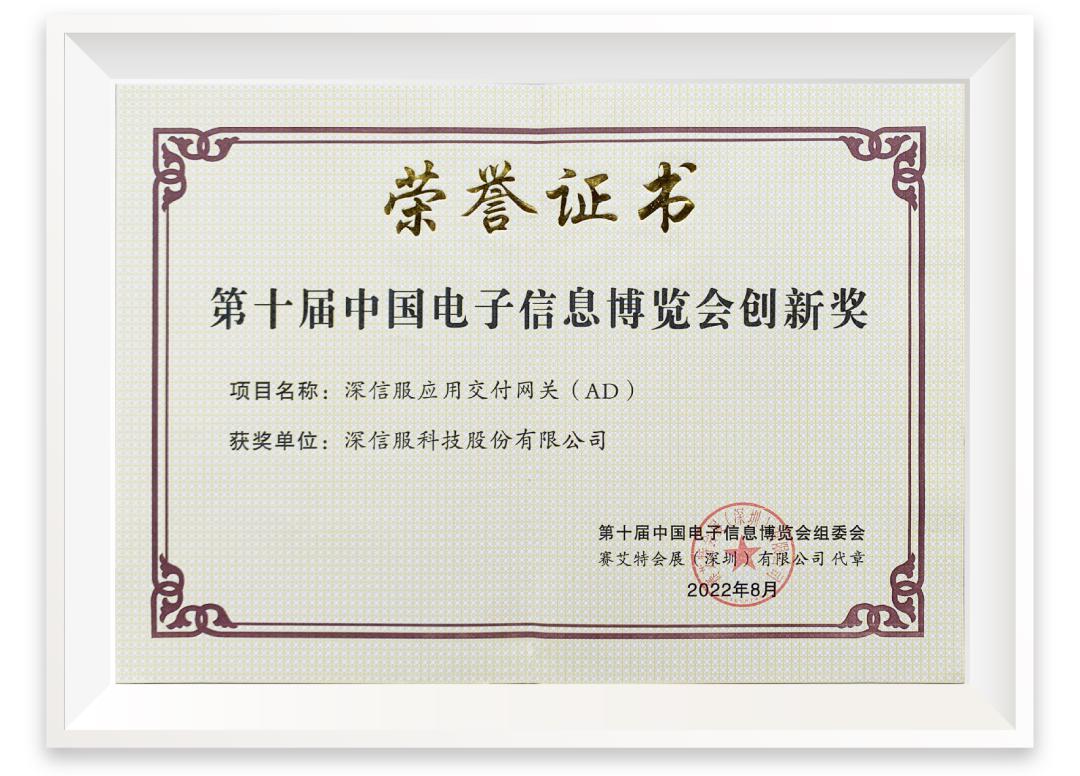 在第十届中国电子信息博览会(CITE 2022)中,深信服信创应用交付AD收获“第十届中国电子信息博览会创新奖”。