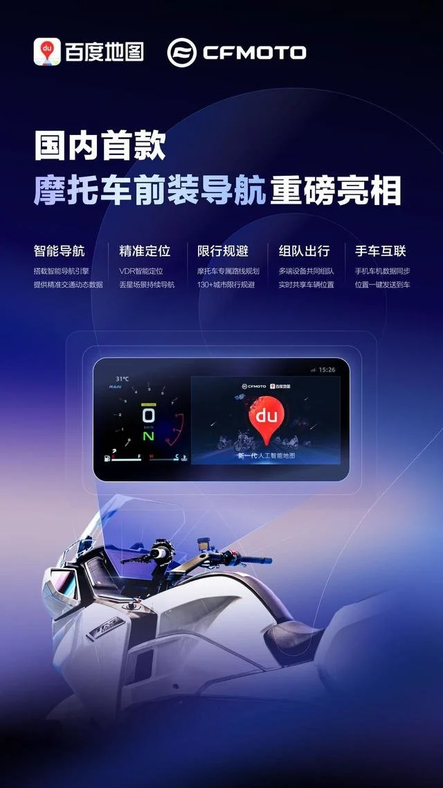 日前,国内地图导航平台百度地图宣布,已与春风摩托合作,将推出适配摩托车的车机导航系统,春风摩托旗下的三款车型率先搭载该系统。