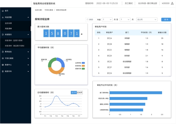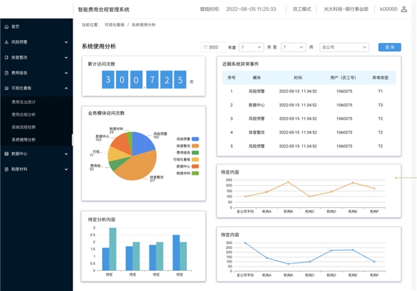 智能费用合规管理平台是由光大科技自主研发,以满足企业发展需求及审计、巡视等内外部检查为目标,面向有费用精细化管理需要和深挖数据价值诉求的企业,所打造的一款专业化、智能化费用合规管理与分析产品。