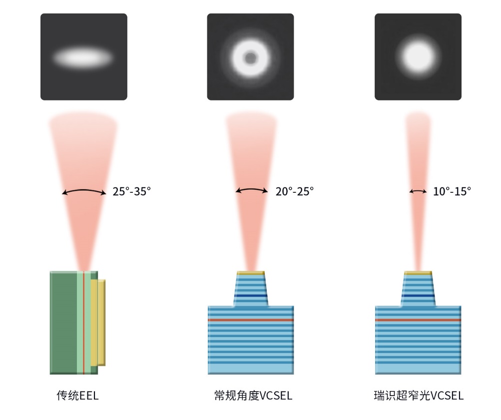 瑞识超窄光VCSEL技术为LDS激光雷达提供光斑尺寸更小光型更加均匀的圆形光斑(右),克服了传统EEL激光的椭圆形光斑(左)和常规角度VCSEL光斑中间暗四周亮的不足(中)。