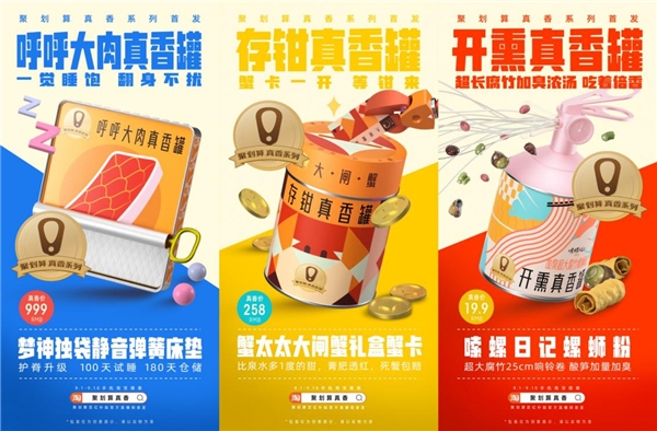 为了将「真香系列」的概念具象化,俘获消费者的青睐,聚划算首先摇身一变,化身真香制罐厂,将优质商品包装为真香罐头,把产品“开罐见真香”的差异化卖点和定位通过趣味表达传递给消费者。比如将梦神独袋静音弹簧床垫包装成五花肉样子的“呼呼大肉真香罐”,让人一看就沉浸到“睡得真香”的氛围里;嗦螺日记螺蛳粉则被打造成仿佛能闻到味儿的“开熏真香罐”,将其“吃得真香”的核心卖点清晰呈现;蟹太太大闸蟹礼盒蟹卡被设计成“存钳真香罐”,“蟹卡一开等钳来”的创意包装让人充满期待。