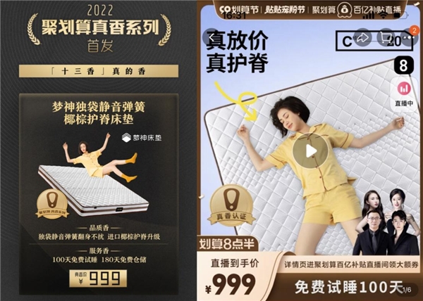 这种节奏分明、流量确定的运营策略带来的销量效果是明显的。据了解,本次99划算节期间,奈雪的茶人气王青脆套餐被认证为「真香系列」好物后,短短几天即卖出近万份,成功实现声量和销量双赢。此外,通过及达人层层测评的真香认证好物——梦神床垫,在聚划算百亿补贴直播间及聚划算内容营销矩阵的加持下,单品成交很快突破百万,成为了弹簧床垫的爆款好货。