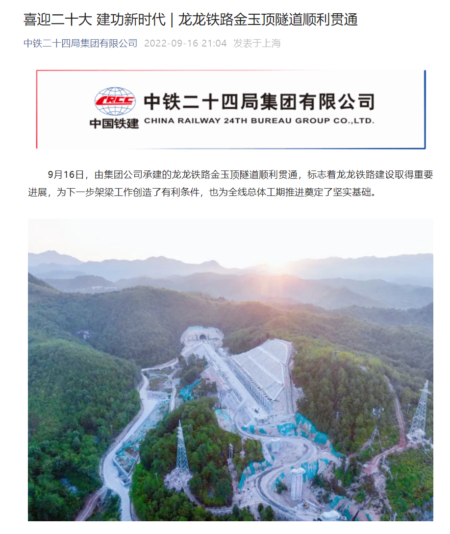 9 月 19 日消息,据新华社报道,从中国铁建股份有限公司获悉,由中铁二十四局集团负责施工的龙(岩)龙(川)铁路金玉顶隧道顺利贯通。