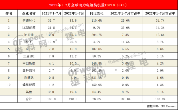 今日(9月5日),韩国市场调研机构SNE Research发布2022年1-7月全球动力电池装力量TOP10数据。