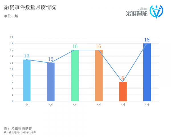 从时间维度上来看,2022上半年,融资事件的峰值出现在6月,发生18起,5月融资数量最少,仅为6起,平均每月发生13起融资事件。