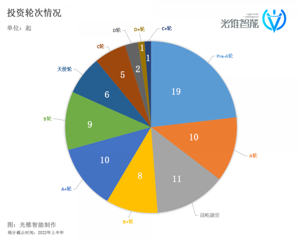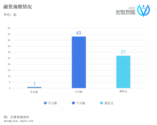 据光锥智能的不完全统计,截至2022年上半年,已披露的融资事件数量总计82起,融资累计总金额超50亿元,其中27起超亿元人民币。