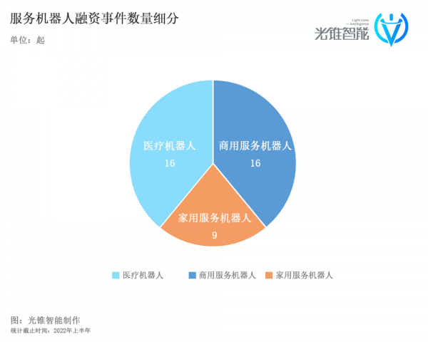 在服务机器人领域,根据获得融资的企业,共分为医疗机器人、商用服务机器人和家用服务机器人三大类。其中,商用服务机器人获得融资16起,医疗机器人在上半年也备受资本关注,融资数量同样为16起,而家用服务机器人在上半年相对遇冷,仅发生了9起融资事件。