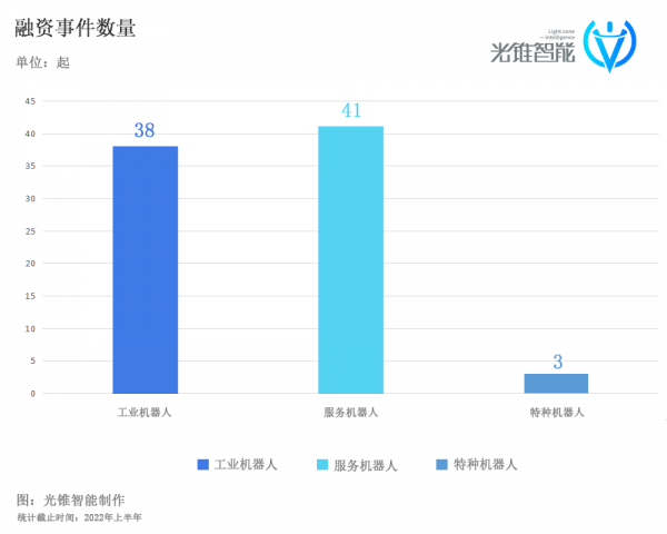 在已披露的融资事件中,工业机器人赛道38起、服务机器人赛道41起,而特种机器人为3起。投资领域偏好明显,工业机器人和服务机器人赛道较为突出。