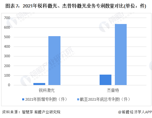 2021年锐科激光及子公司累计获得授权专利509项。杰普特截至2021年底共有专利636项,申请新专利109项。总体来看杰普特在专利总数和新增专利上占有优势。