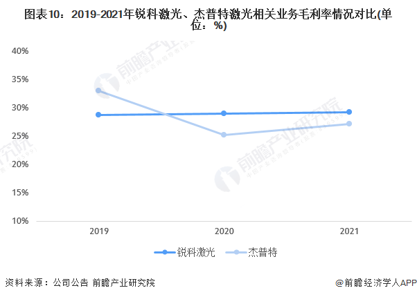 从毛利率来看,2019-2021年,锐科激光业务毛利率稳定在29%左右,2021年为29.34%;2019-2021年杰普特激光业务毛利率波动下跌,2021年为27.24%,整体低于锐科激光。
