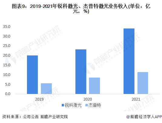 2019-2021年,杰普特激光业务收入逐年上升,2021年实现11.4亿元,整体来看,锐科激光激光业务收入高于杰普特。