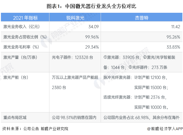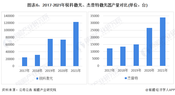 根据公司公告,锐科激光2017-2021年激光器产量波动上升,2021年超过12万台;几乎是2018年6倍;杰普特激光器产量稳步上升,2021年接近3.4万台,但整体来看锐科激光的激光器产量更大。