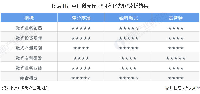 激光行业属于技术、资金双密集产业,此外,激光市场份额和业绩能反应公司产品的市场销售状况。基于前文分析结果,前瞻认为,锐科激光因在产量规划、营业收入、毛利率、投资规模等方面占有优势,尽管杰普特在激光产业链布局更广,研发投入力度相对更大,但是从可持续发展的角度看,未来锐科激光国产化进程及实现国产占有率第一的潜力更大。