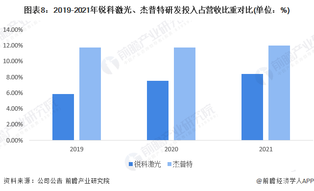 2019-2021年,锐科激光研发投入占营业收入比重在6-8%左右,占比呈上升趋势;杰普特研发投入占营业收入比重为11%左右,占比三年稳定。整体来看,杰普特研发占比高于锐科激光。
