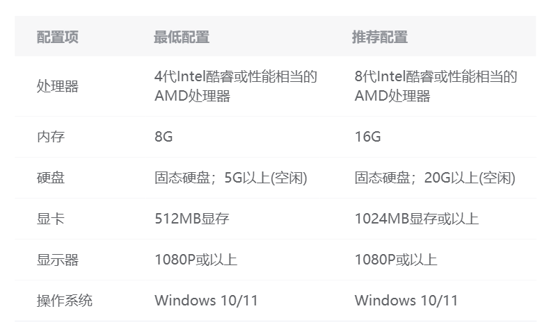 最低配置为 4 代 Intel 酷睿或性能相当的 AMD 处理器,8GB 内存,5GB 以上空闲固态硬盘,512MB 显存,1080P 或以上显示器。