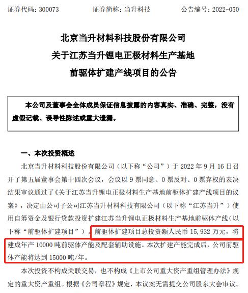 9月16日,三元正极材料龙头企业当升科技(300073。SZ)发布公告称,公司于9月16日召开了第五届董事会第十四次会议,审议通过了《关于江苏当升锂电正极材料生产基地前驱体扩建产线项目的议案》,决定由公司子公司江苏当升使用自筹资金及银行贷款,投资扩建江苏当升锂电正极材料生产基地前驱体产线。