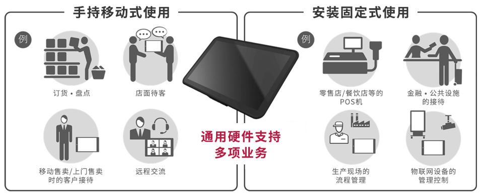 该产品可通过专用底座和扩展坞来连接各种外围设备及物联网设备,具备相当于IP54(注1)的防尘防滴性能、耐摔强度1米(注2)、抗菌抗规格(注3)等。这是一款兼具坚固性和耐环境性、支持各种业务场景的数字化变革的商用平板终端,如工厂及仓库的流程管理和作业指示,零售店铺的订货、盘点和考勤管理等后台业务,店面的待客支援和预处理,金融、公共、酒店的接待和业务指示等,都可广泛应用。外观方面,考虑到该终端摆放在触目可及的地方及其服务用途,采用了时尚的设计。此外,由于采用了USB Power Delivery,可通过移动电源进行供电,因此可在电源环境不完善的活动会场和室外使用,也可在灾害发生时保证业务的持续性。