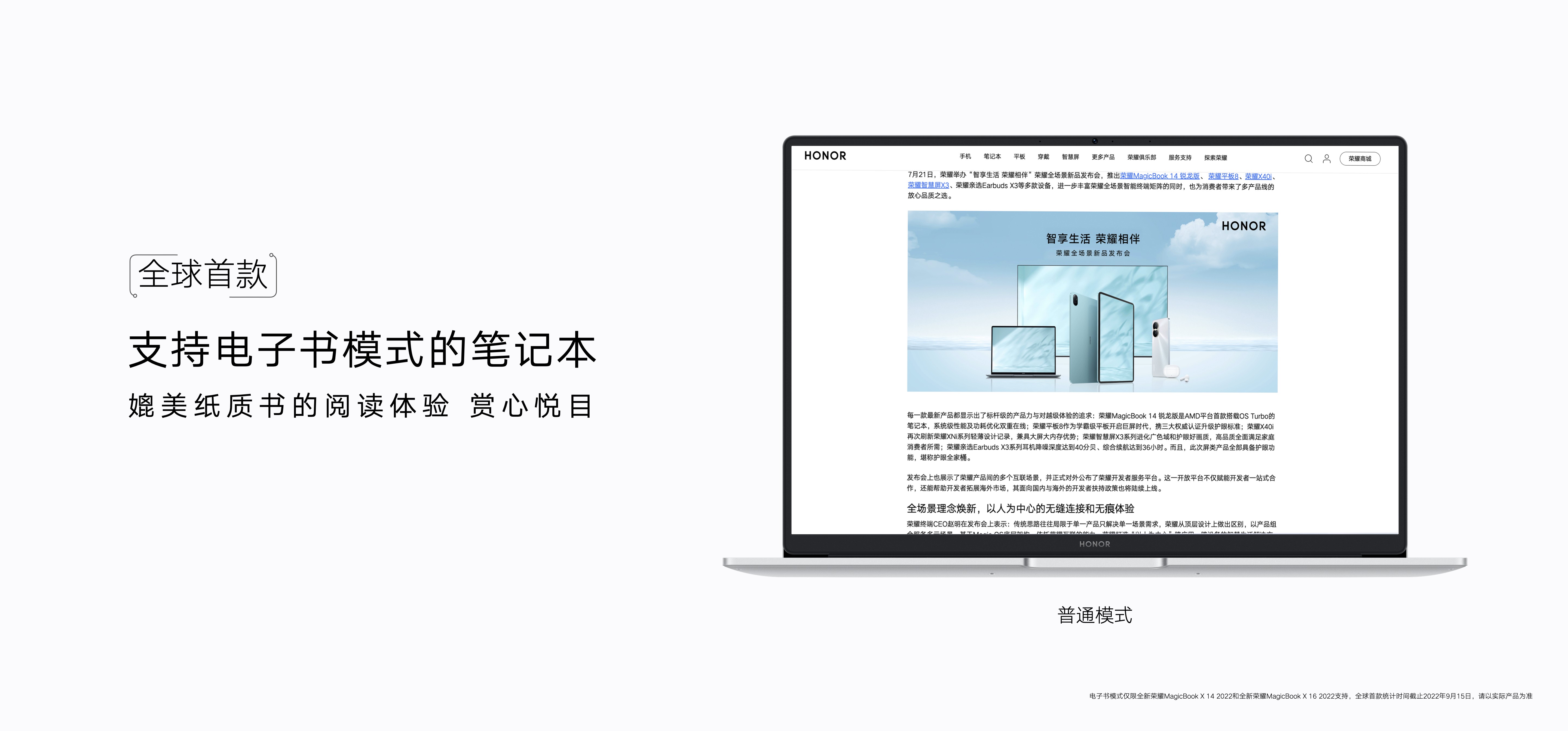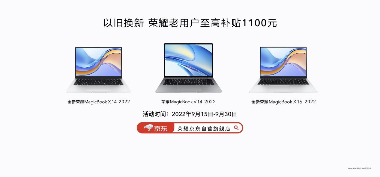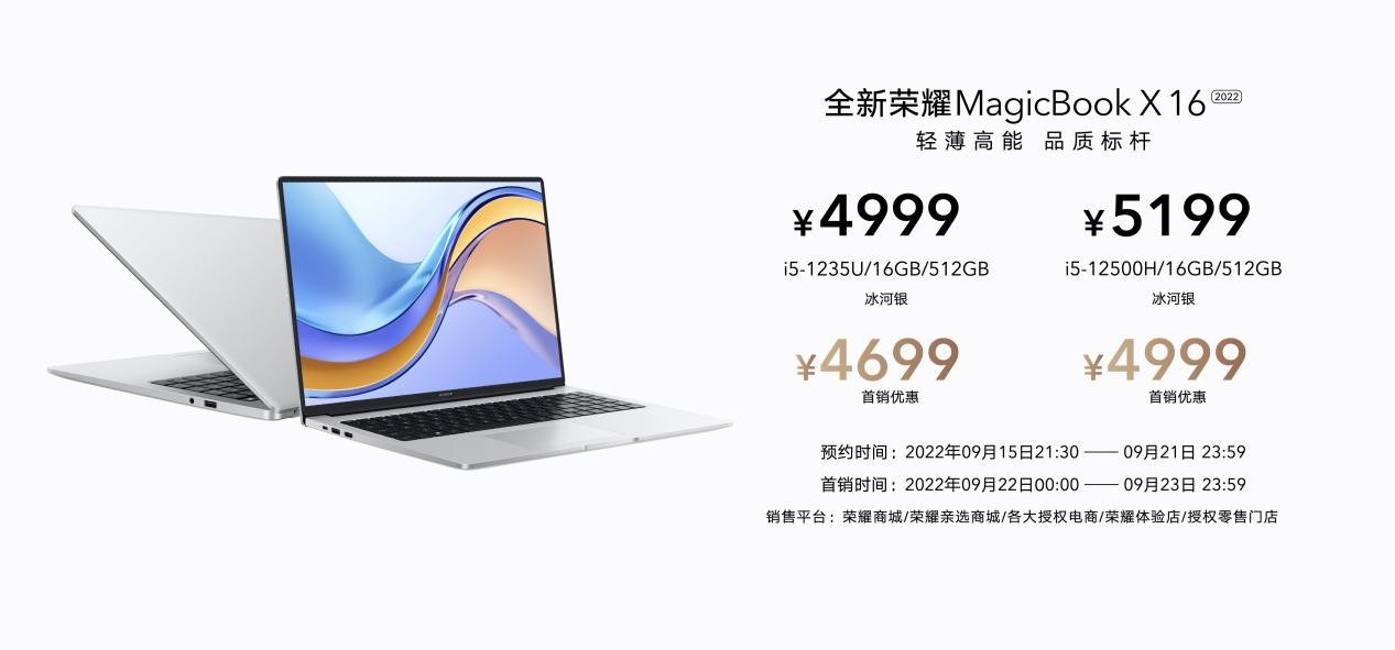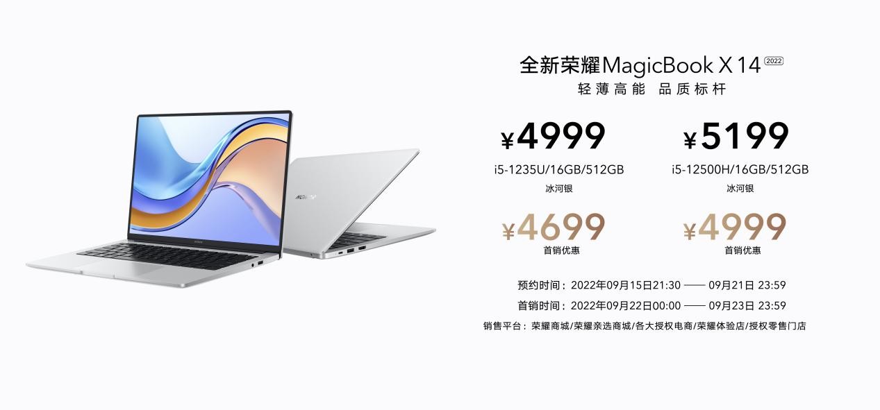 2022年9月15日21!30-9月21日23!59,全新荣耀MagicBook X系列将在荣耀商城、各大授权电商、荣耀体验店、授权零售门店开启预约,9月22日00:00-9月23日23:59开启首销,首销优惠价4699元起。2022年9月15日-9月30日,荣耀京东自营旗舰店正式开启以旧换新活动,荣耀MagicBook X系列、V系列,老用户至高补贴1100元。