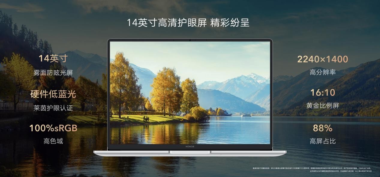 屏幕层面,全新荣耀MagicBook X 14 笔记本 2022采用14英寸IPS雾面屏,16!10的黄金屏幕比例,支持2。2K高分辨率,屏占比高达88%,搭配300nits的高亮度,让色彩更加绚丽丰富;全系通过德国莱茵低蓝光、无频闪双重护眼认证,能够有效降低有害蓝光光源,降低入眼辐射,更专业地保护用户眼部健康。