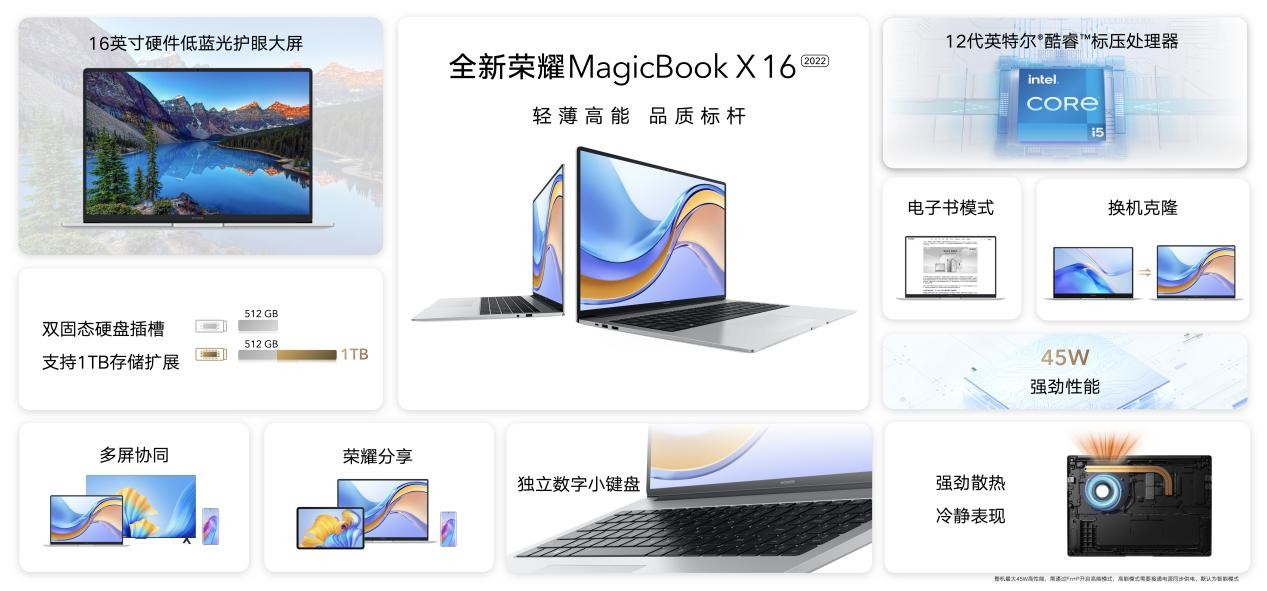 屏幕层面,全新荣耀MagicBook X 16 笔记本 2022屏占比高达89%,宽广大视野让娱乐和办公更加高效,带来更为沉浸的娱乐影音享受;性能层面,最高搭载英特尔12代酷睿标压处理器i5-12500H,整机最高可实现45W性能释放,轻松满足用户日常办公所需。