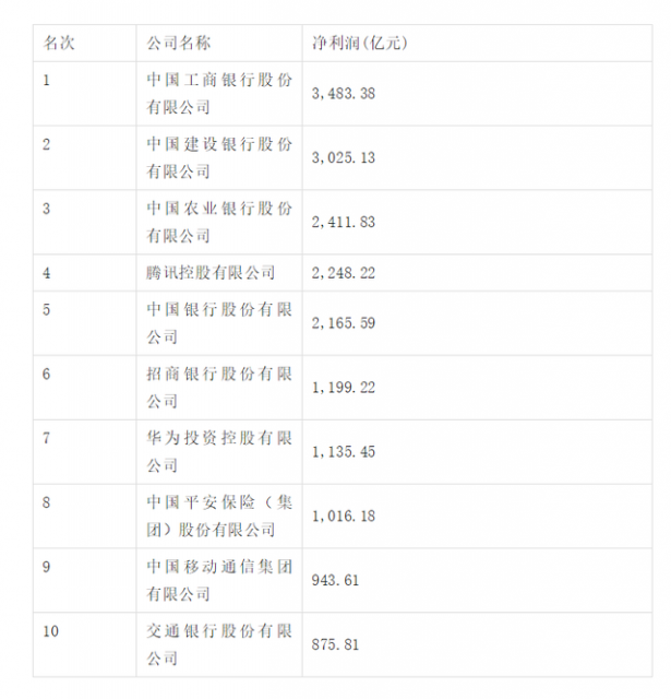 净利润方面,中国工商银行股份有限公司以 3,483。38 亿元净利润排名最赚钱榜单第一,中国建设银行股份有限公司,中国农业银行股份有限公司列二三位。腾讯控股有限公司,中国银行股份有限公司,招商银行股份有限公司,华为投资控股有限公司,中国平安保险(集团)股份有限公司,中国移动通信集团有限公司,交通银行股份有限公司入围“2022 中国企业 500 强净利润前 10 名”。