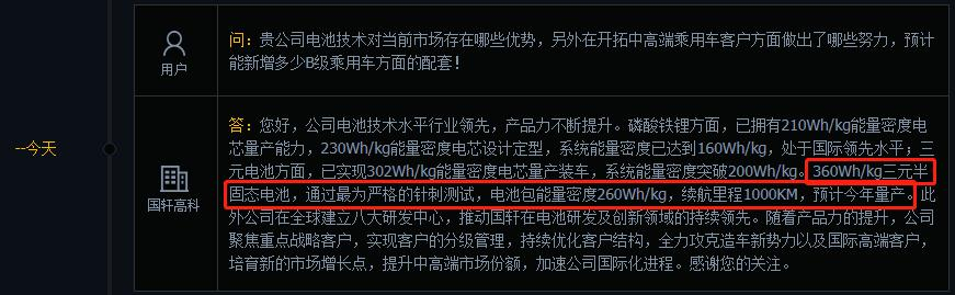 9月14日,国轩高科在投资者互动平台上表示,公司电池技术水平行业领先,产品力不断提升: