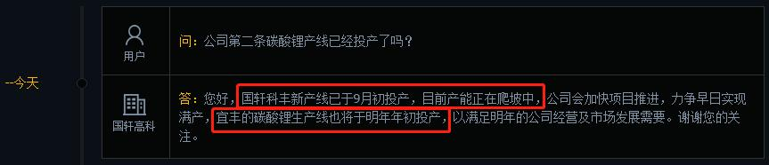 最新的互动问答显示,国轩科丰新产线月初投产,目前产能正在爬坡中;宜丰的碳酸锂生产线也将于明年年初投产。