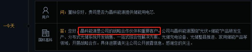 是否为晶科能源提供储能用电芯方面,国轩高科称:“晶科能源是公司的战略合作伙伴和重要客户。公司与晶科能源围绕‘光伏+储能’产品研发生产、分布式光储系统开发销售、一站式综合性解决方案、光储充电设备、光储整县推进、家用储能产品等领域,开展战略合作。”