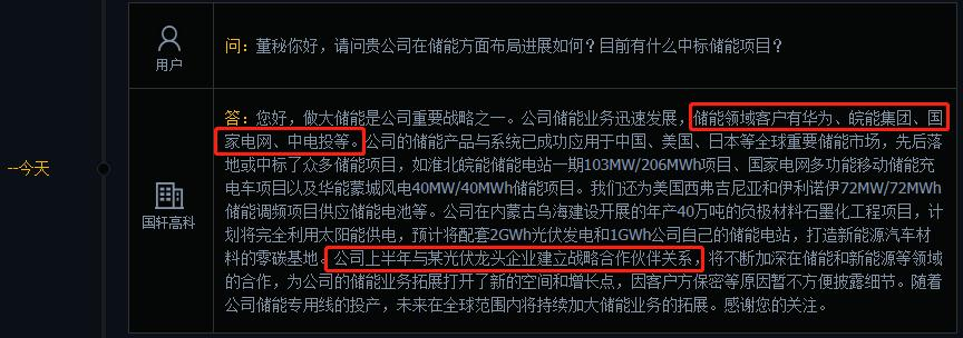 国轩高科透露:“公司上半年与某光伏龙头企业建立战略合作伙伴关系,将不断加深在储能和新能源等领域的合作,为公司的储能业务拓展打开了新的空间和增长点,因客户方保密等原因暂不方便披露细节。”
