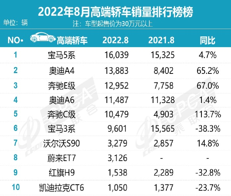 来到高端轿车市场,奥迪A4、奔驰E级和奔驰C级在销量上均实现了同比大幅增长,特别是奔驰C级,同比增幅甚至达到了113.7%。但在8月份的高端轿车市场,表现最出色的还是宝马5系,以16039辆的成绩夺得冠军。