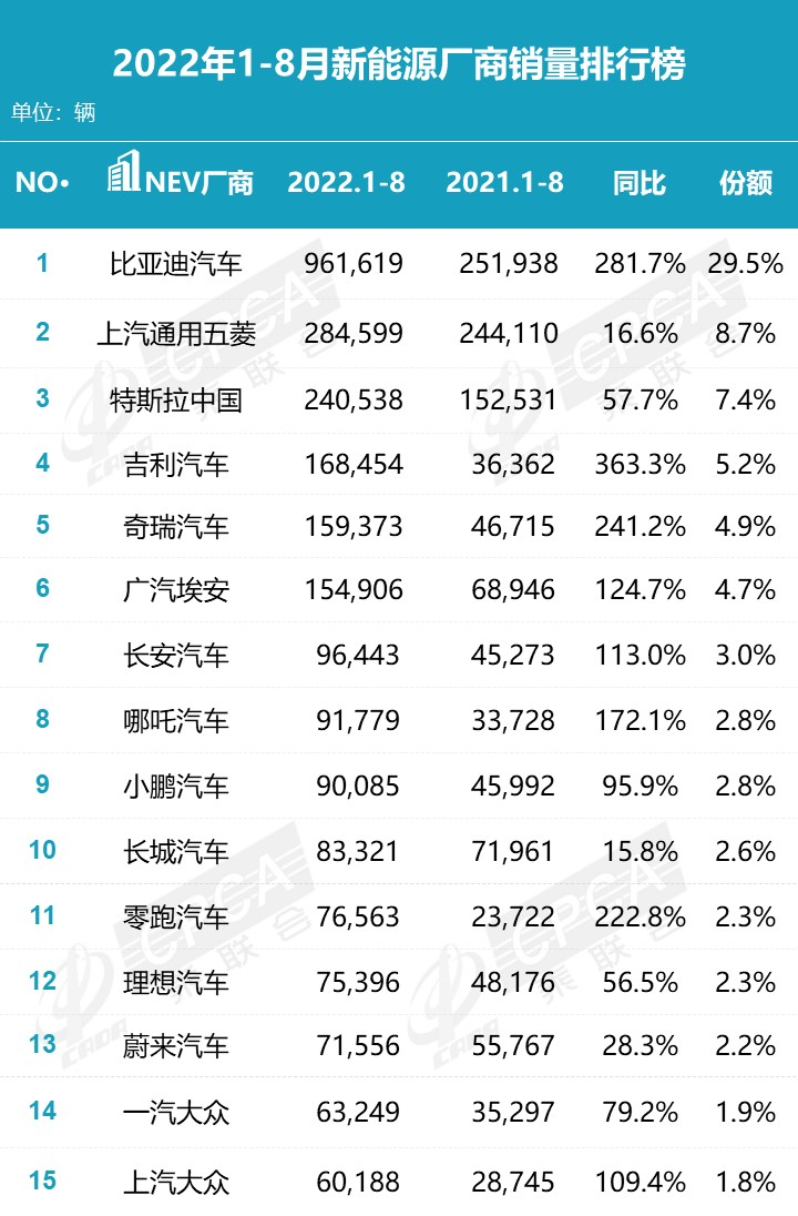 2022 年的汽车市场,最耀眼的明星当然属于比亚迪,根据中国乘联会统计数据,今年 1-8 月。比亚迪总共销售汽车 96 万 1619 辆,同比增长 281.7%,占据新能源汽车市场三成份额。无论从哪个角度看,比亚迪都是今年新能源汽车最大的赢家。