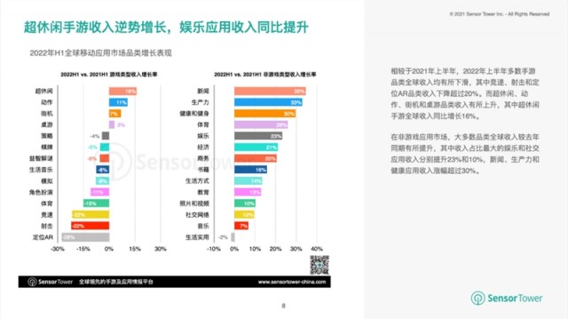 2022年上半年全球各大移动应用品类收入普遍呈现上升趋势,其中收入占比最大的娱乐和社交应用收入同比提升23%和10%,新闻、生产力和健康应用收入同比涨幅超过30%。