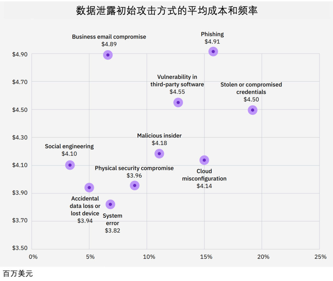 报告中还指出,使用凭证偷取或凭证泄露仍然是导致数据泄露的最常见原因。在2022年的研究中,这种攻击方式占19%。而在2021年的研究中,占20%。由被盗或泄露的凭证造成的破坏平均成本为450万美元。这些漏洞的生命周期最长,243天发现入侵,还有84天来遏制入侵。
