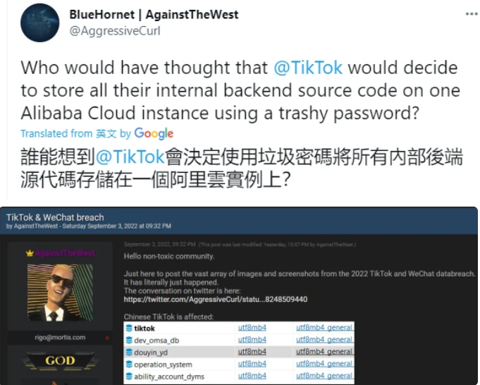 另外一起数据安全事件,在上周五,一个名为“AgainstTheWest”的组织在一个论坛发帖声称已经入侵了TikTok和国内某知名IM平台,并公布了一个Tiktok和国内某知名IM平台的数据库屏幕截图。
