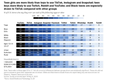 除了年龄的不同导致的平台喜好不同之外,性别因素也对青少年们选择社交媒体平台有一定的影响!处于青少年时期的女孩们更偏向于使用TikTok、Instagram和Snapchat,男孩更偏向于使用过Twitch和Reddit,在YouTube的使用比例上,男孩也高于女孩