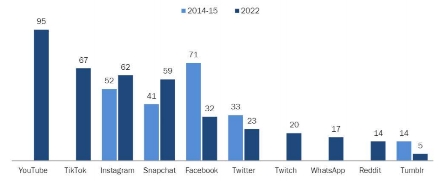 根据皮克中心对13-17岁的美国青少年进行的数据显示,YouTube以95%的比例在美国青少年社交媒体名列前茅。自2017年TikTok进入美国市场以来,人气急剧上升,目前已约67%的青少年在使用TikTok位列第二,成为青少年社交媒体中的姣姣者。其次是Instagram和Snapchat,这两个平台都被大约60%的青少年使用。在这些平台之后,是Facebook,值得注意的是,曾经的社交媒体霸主Facebook似乎已逐渐失去年轻一代的欢心,使用Facekbook的青少年比例由2014-2015年的由71%骤降至现在的32%。而使用Twitter、Twitch、WhatsApp、Reddit和Tumblr的青少年比例相对较小。