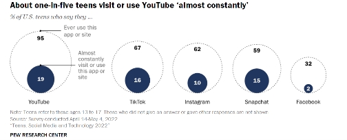 皮克研究中心还了青少年在海外五大社交网络中的使用频率。从整体来看,35%的青少年“几乎一直”至少使用其中一种,19%的青少年经常使用YouTube,而TikTok、Snapchat、Instagram及Facebook来说,这一比例分别是16%、15%、10%及2%。