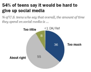 在关于他们花在社交媒体的时间上,55%的美国青少年认为他们花在社交媒体上的时间合理,36%的青少年年认为花在社交媒体上的时间太多,8%的青少年认为花在这些平台上的时间太少。