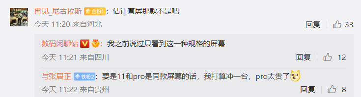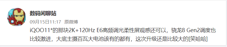 屏幕方面,该博主此前表示,iQOO 11 系列新机将采用2K 分辨率 120Hz 刷新率的单挖孔柔性屏,该屏幕采用 PWM 调光,三星 E6 基材。今日,该博主称 iQOO 11 系列屏幕“观感还可以”。同时,该博主强调到“只看到一种规格的屏幕”,因此有网友猜测 iQOO 11 标准版和 iQOO 11 Pro 将采用同一款屏幕。