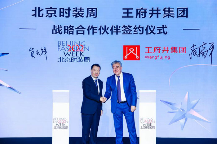王府井集团总裁尚喜平和2022北京时装周组委会执行主席、北京时尚控股有限责任公司党委常委、副总经理贠天祥,共同签署北京时装周组委会与王府井集团战略合作伙伴协议
