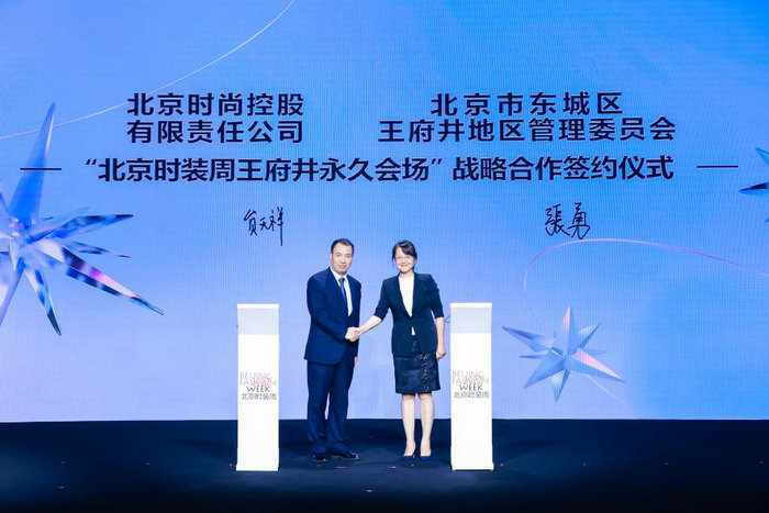 北京市东城区王府井地区管理委员会党组书记张勇和2022北京时装周组委会执行主席、北京时尚控股有限责任公司党委常委、副总经理贠天祥,共同签署王府井管委会与北京时装周组委会“北京时装周王府井永久会场”战略合作协议