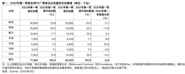Gartner:2022年Q1全球PC出货量下降6.8%联想下降11.1%