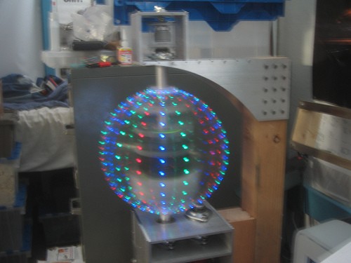 这次当然不是要介绍高科技的电子花车,而是要介绍一个投影机。这个投影机为球形,成像是透过红蓝黄三色的LED,然后透过1800rpm的高速旋转,利用人类的视觉残留,投射出3D的影像,据说还能投出影片,只是目前的成像质量只有3bit而已。