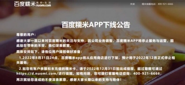 9月20日消息,百度糯米在官网贴出百度糯米AP下线公告,公告称由于公司战略调整,百度糯米App将停止服务与运营,预计在2022年12月正式停止相关服务。有账户余额和未充值的糯米卡,请于2022年12月31日前完成提现。