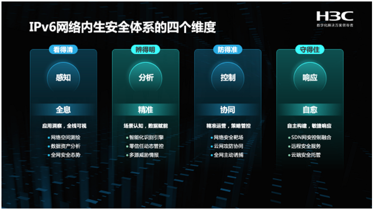 在网络安全方面,IPv6新协议架构也将带来安全领域的技术创新和体系架构变革,从而为解决IPv6+时代的网络安全问题提供新思路、新方法和新手段。新华三基于IPv6+内置安全属性和安全技术创新来构建适用于IPv6+时代的网络安全体系,并提出了“四维一体” IPv6+网络内生安全体系,从感知维解决应用洞察和全栈可视,从分析维解决场景认知和数据赋能,从控制维解决精准运营和策略管控,从响应维解决自主构建,敏捷响应。