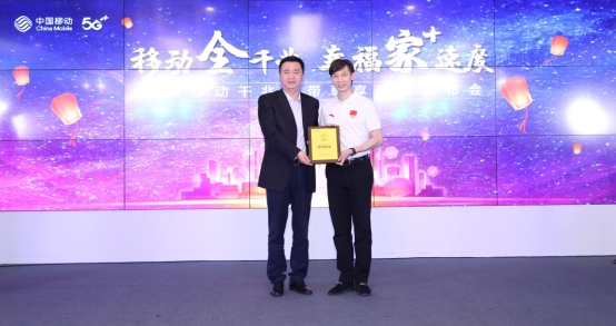 (图为中国移动通信集团市场经营部副总经理孙世伟为“北京移动全千兆尊享体验官”佟健先生授牌)