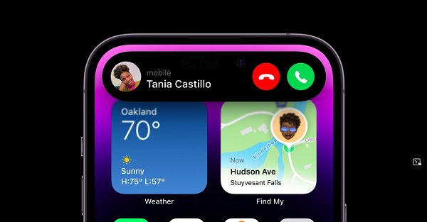 外观上,iPhone14 Pro/Pro Max舍弃了刘海屏设计,转而采用“药丸”挖孔屏,同时通过软硬件结合的方式将这块区域改造为“灵动岛”,从而可以显示不同的信息,包括显示来电弹窗、专辑封面、以及面部解锁等,这种创新的玩法也成为发布会上的一大亮点。