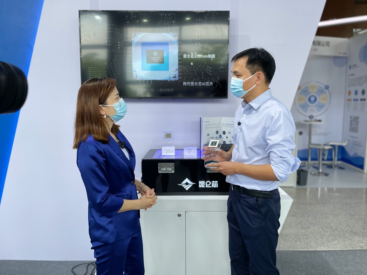 在昆仑芯科技展台,昆仑芯科技CEO欧阳剑接受第一财经电视采访,介绍昆仑芯芯片产品的创新技术优势,并围绕芯片产业的机遇与挑战发表深刻见解。他表示,国内的芯片产业具有资本、技术和人才优势,正面临需求侧新机遇,也面临着对芯片的通用性、易用性产生更高要求等挑战。