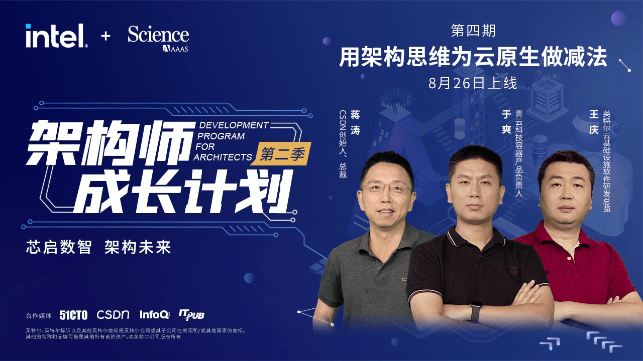 观看英特尔联合国际学术期刊《科学》共同推出的“架构师成长计划”第四期《用架构思维为云原生做减法》精彩回放点击链接: