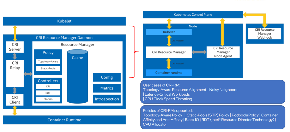 在 Kubernetes 发布初期,针对 CPU 和内存的管理与分配做的比较简单,随着新版本的发布,逐步有一些新的功能加进来(如 CPU Manager、Topology Manager 等),但 Kubernetes 缺省的 CPU Manager、Topology Manager 仍无法了解服务器级硬件的复杂内部架构和 CPU 本身的能力,这就可能会导致 CPU 的资源分配决策和计算性能无法达到最优。对于英特尔®至强®可扩展处理器来说,其架构复杂、功能强大,如果想要在上面部署 Kubernetes 集群来高效支撑云业务,就需要对其拓扑结构和 CPU 的强大功能暴露给 Kubernetes集群,这时英特尔® CRI-RM 因此而生。